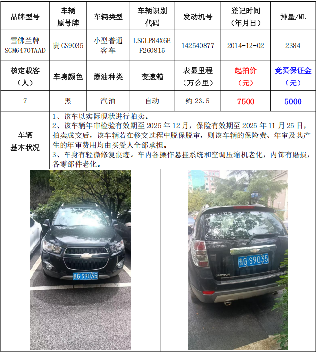 1、雪佛蘭牌SGM6470TAAD小型普通客車1輛,起拍價:7500元,競買保證金:5000元。
