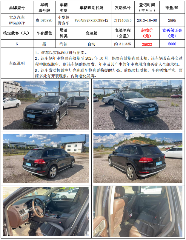 2、大眾汽車WVGAB97P小型越野客車1輛,起拍價:25022元,競買保證金:5000元。
