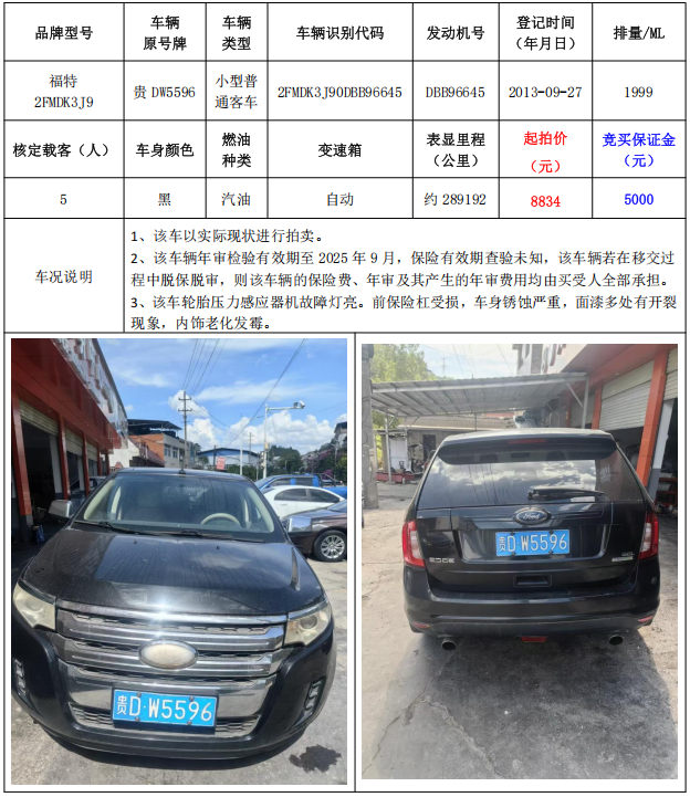 3、福特2FMDK3J9小型普通客車1輛,起拍價:8834元,競買保證金:5000元。
