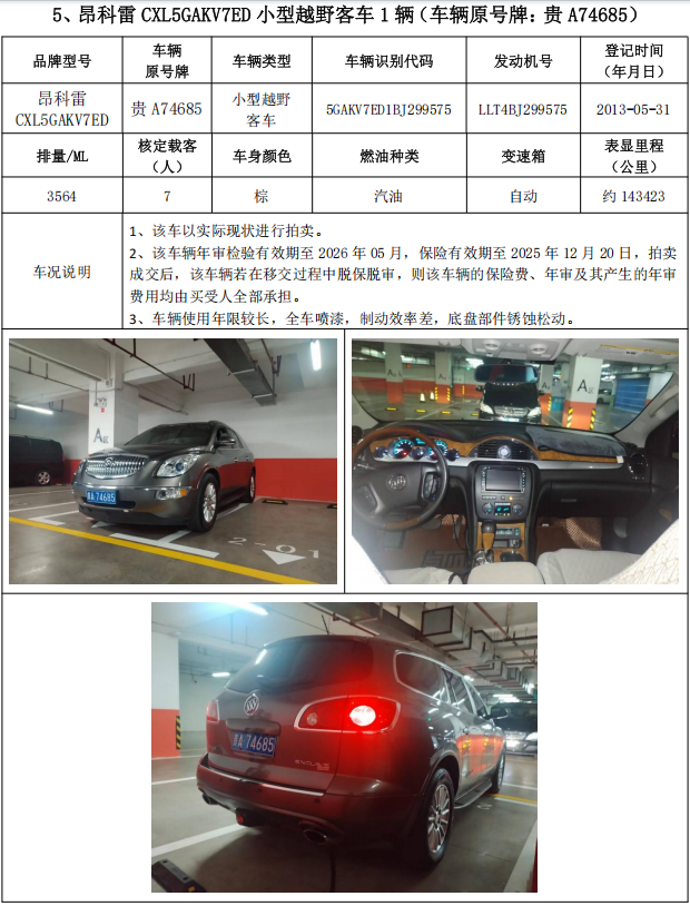 拍品編號1:普瑞維亞小型普通客車1輛、奧迪牌小型轎車2輛、昂科雷小型越野客車2輛,共計5輛,整體拍賣