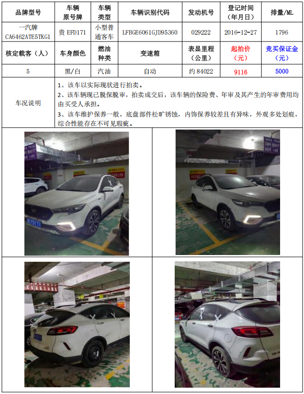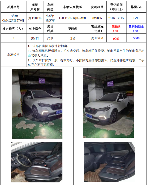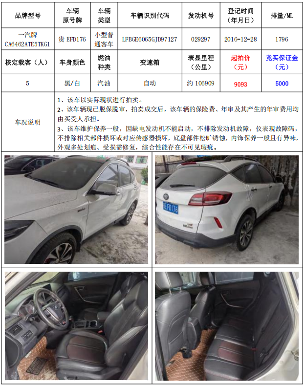 拍品編號2:一汽牌CA6462ATE5TKG1小型普通客車1輛車輛原號牌:貴EFD175)