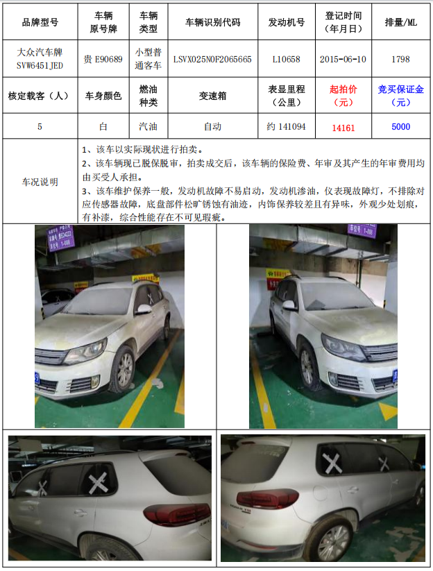 拍品編號7:大眾汽車牌SVW6451JED小型普通客車1輛(車輛原號牌:貴E90689)
