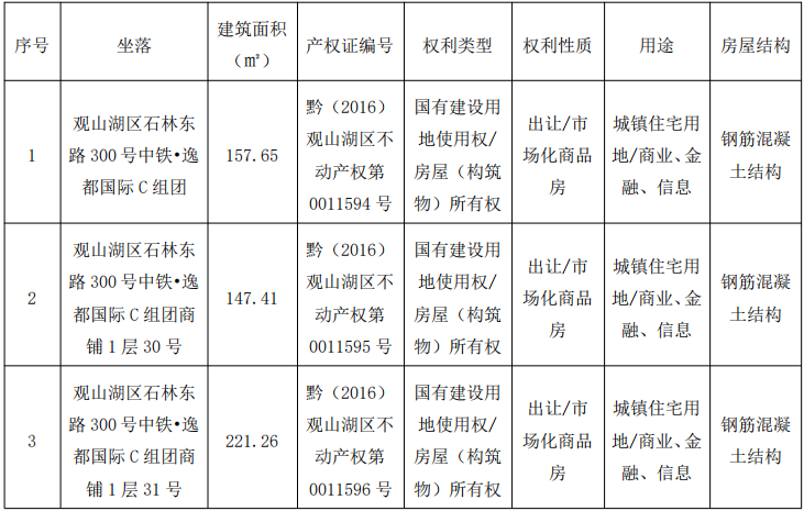 貴陽市觀山湖區(qū)石林東路300號(hào)中鐵·逸都國際C組團(tuán)商鋪、1層30號(hào)商鋪、1層31號(hào)商鋪,共計(jì)3間,建筑面積分別為:157.65㎡、147.41㎡、221.26㎡(注:該標(biāo)的采用先整體后分拆的拍賣方式),總起拍價(jià):1115.86萬元,競買保證金:100萬元。